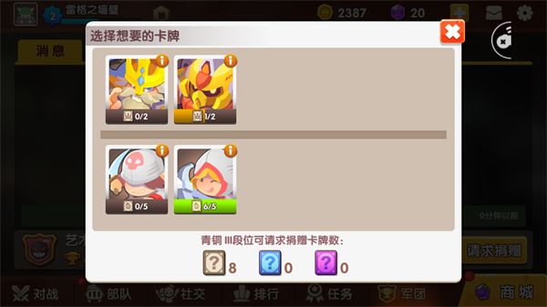 除了一些游戏玩法的优化调整,我们设计增加了全新版块:军团系统。加入军团不仅可以交流认识更多小伙伴,同时有个很重要的功能:请求捐赠。军团成员可以将不主培养的卡牌捐赠给其他成员,也可以请求其他成员捐赠自己需要的卡牌,这样培养卡牌的效率便可以大大提升,可以说是非常方便了!
