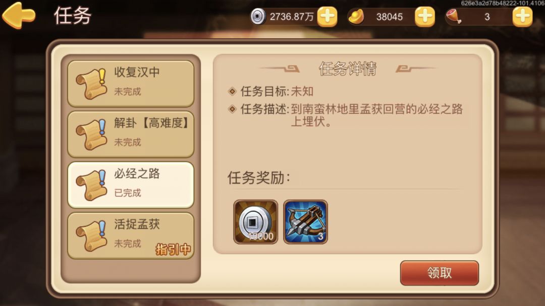 孟获任务每次到这里都点不了领取。必须重新进游戏才行。