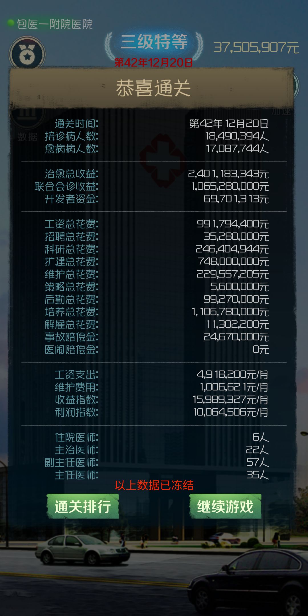 最后说一下三甲升三特的注意点,因为达到教授级别后,学生实习会永久增加该科室科研率,一般三甲科研率22%就可以考虑研发了,另外三甲升三特要求每月净利润一千万,除了各科室达到世界级,研发达到10级之外,主任医师治愈10级疾病是三甲收入的重要手段,所以每个科室最少需要两名主任医师培养满级,一般每个科室3位培养满级就差不多一千万收入了。