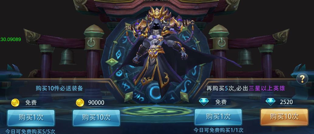 每次花费10000金币,并且每天具有5次免费机会。有机会获得物品或伙伴。十连抽肯定会获得装备