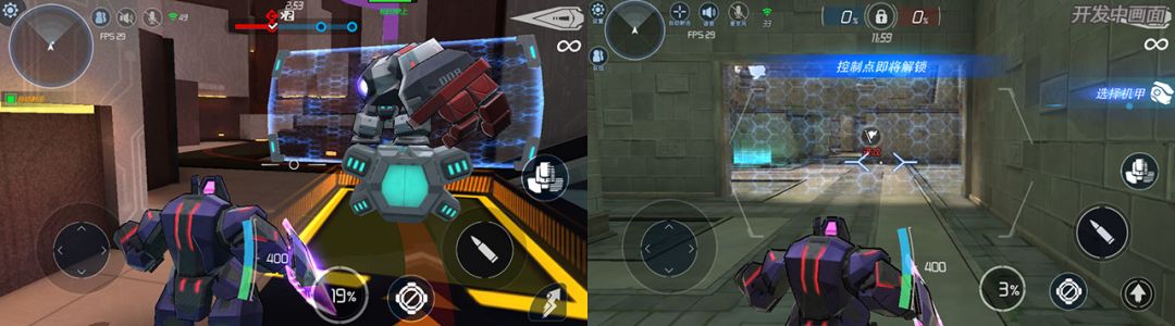然后,由于首测过程中,很多机长反馈操控机甲所占屏幕的比例实在是太大了,非常影响视野,感觉笨笨重重的。于是我们率先调整了机甲的整体大小与操作站位,现在战斗中视野变宽,可以看到更多信息。并且优化了机甲库的展示动作,现在机甲库中可以看到更完整的机甲和他们更帅气的POSE。