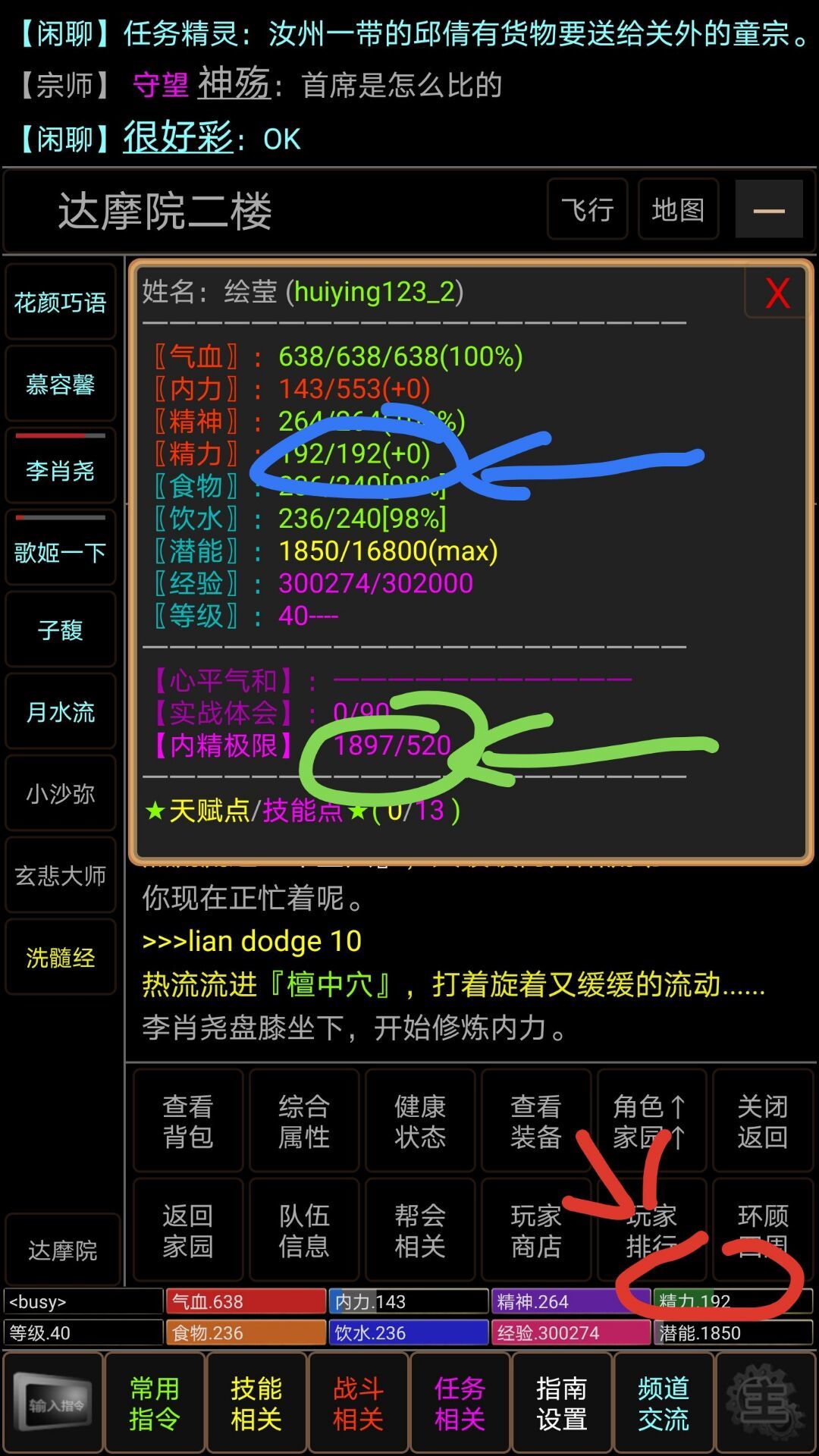左下角红圈指出来的绿条条就是我们的精力了,很明显可以看到,它离占满整个框框还有一段不小的距离,而这个长长的黑条就是你的当前精力上限和精力极限所差的数值了~除了通过黑条条直观地看出距离极限的差距,还可以通过(常用指令)→(健康状态)打开图示面板,蓝圈指出来的数值的左边是你当前精力值,右边是你当前精力上限,绿圈指出来的内精极限,左边是你能达到的内力最大值,右边是你能达到的精力最大值也就是精力极限。通过精力极限减去精力上限,就可以得知自己差多少到达极限了![[嗒啦啦2_乖巧]](https://img-tc.tapimg.com/market/images/e1c24f8566fda8255009cae7e503676c.gif)