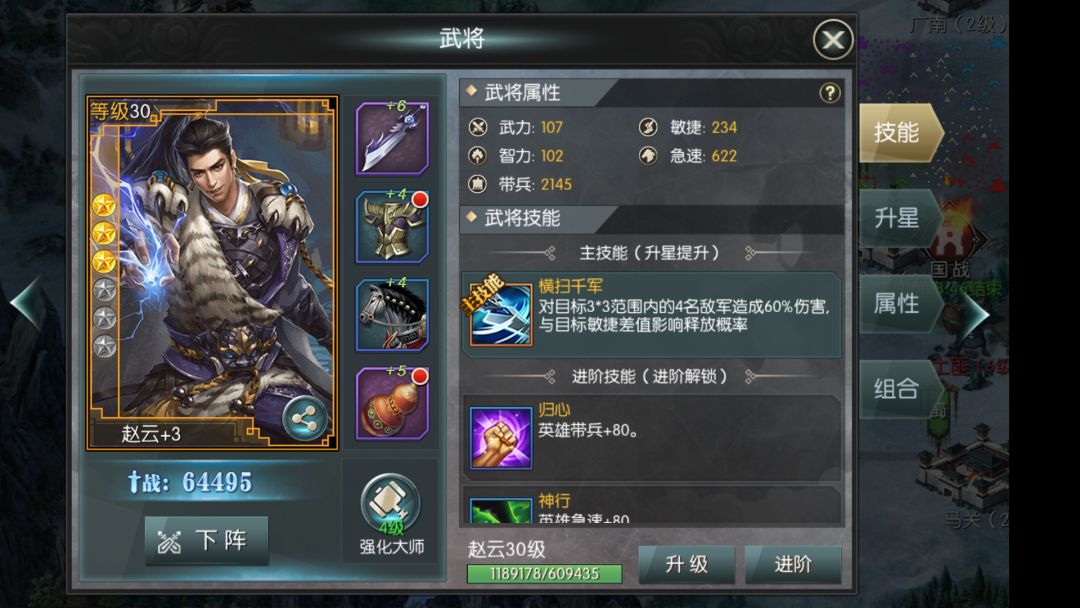 前期装备比较难获得好的,蓝色以上的装备就可以进行强化,强化可以增加宝石槽。全身相同的强化等级可以大幅度的增加带兵数量,在前期征战任务和国战中能体现很大的作用。