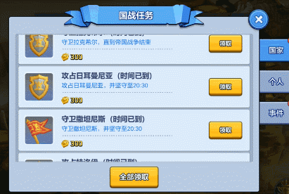 当然,凭借领主强大的实力独自奋战,除了能够获取个人积分排名奖励外,还能完成一些个人任务获取一定量的战功令以及战争物资。不过,想要完成国家任务并顺势取得整场国战的胜利,则必须依靠整个国家的力量。