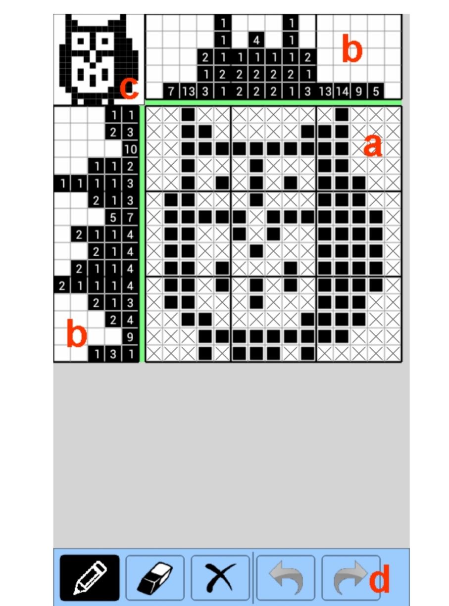 a区)主(解决方案)区域:这是显示解决方案的区域。展示解决方案,根据给出的提示格标记提示区(b),标记格子,它是足以点击它根据所选工具(d),格子将被清除或标记为“填充”选择的颜色和形状或者标记为“不填”与交叉的迹象。也可以选择多个单元格的块。要做到这一点,你必须点击一个开始单元格,然后移动你的手指到另一个最终单元格。选定的工具将应用于所有选定的单元格。