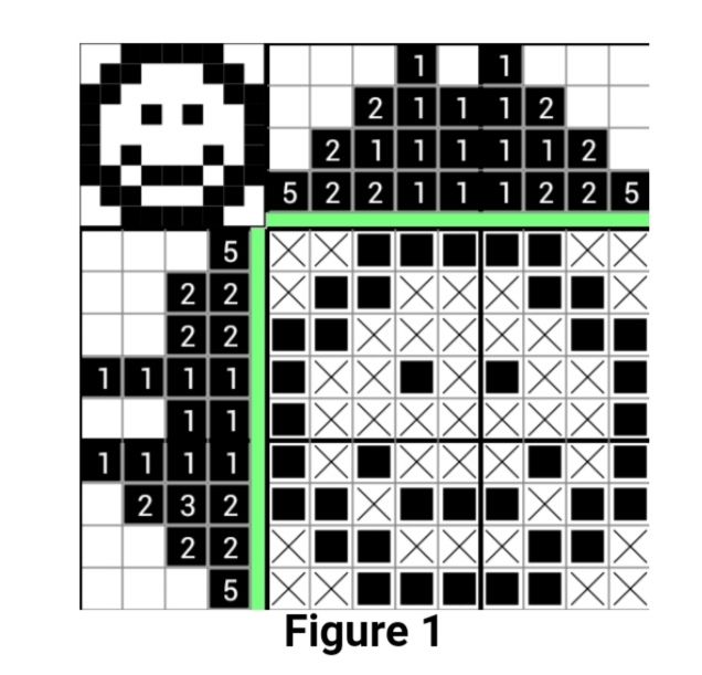 这些提示告诉我们该列或行上有多少块彩色单元格,以及它们出现的顺序。例如,如果一行有一个“4,1”的提示,这意味着这一行有一个由4个连续的实体单元格组成的块,它的右边是一个由1个实体单元格组成的单个块。如果拼图是标准的(黑白),必须有至少一个缺口(空单元标记)在两个块之间,在4个的左边和1个的右边可以有任意数量的空单元标记。即使这不是一个很好的提示,这一行与每一列相交,每一列都有自己的提示。因此,关于行的提示可以帮助推断关于列的事情,列告诉其他行,等等,直到谜题逐渐完成。这个谜题可能有一个标题,这个标题可以提供一个关于最终画面的线索。