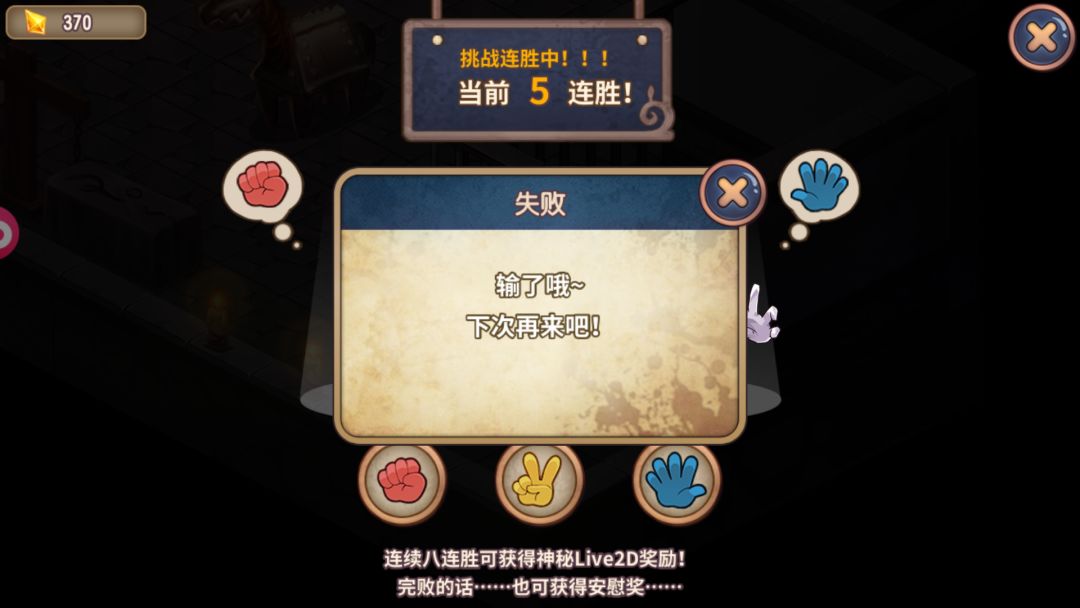 还有就是,6连胜以后,他有可能会重复出的o(≧口≦)o,只想要宝石的小伙伴,尽量到这里就停了。如果是完成成就的小伙伴们,那你们也只能靠运气喽(下面那张图是我手残不小心输的╮(╯▽╰)╭)
