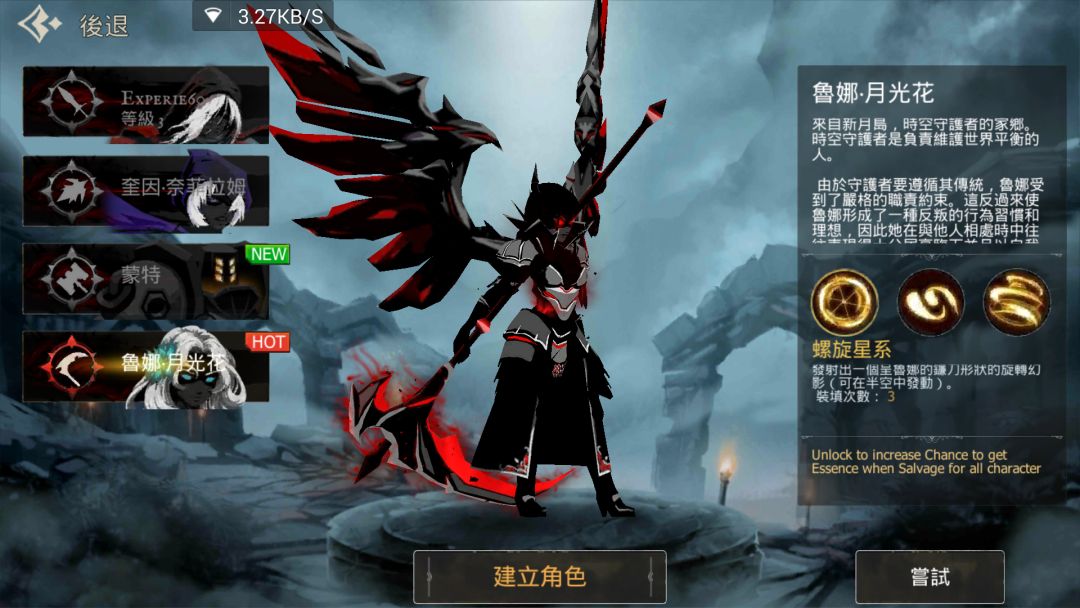 首先我用的是截止5月3号为止1.52.02为最新版的,包名是com.Zonmob.Stickman.FightingGames.ShadowOfDeath,开场新手指导过后返回角色画面可以随时建其余三个角色无限制。