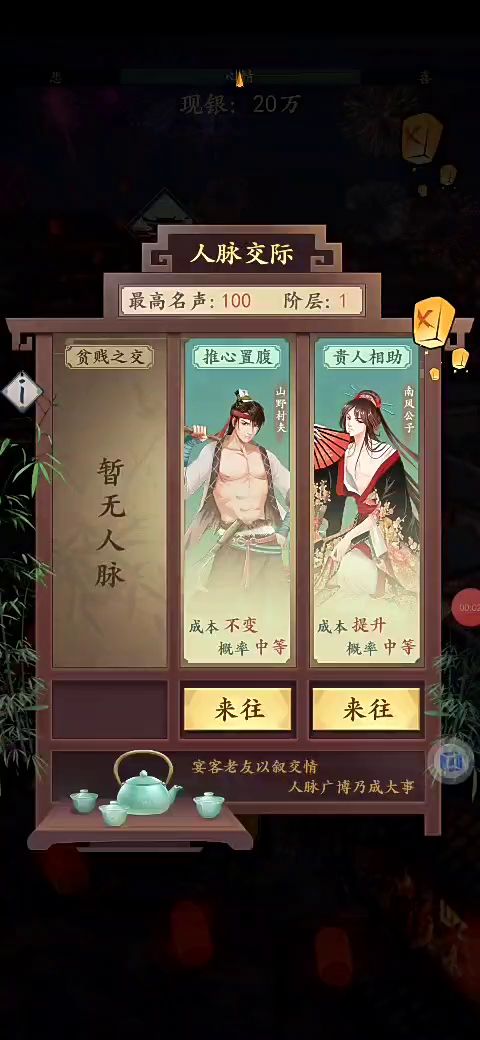贩卖茶水,你只需要选贩卖茶水那个选项就可以,增加十几万现金和60名声