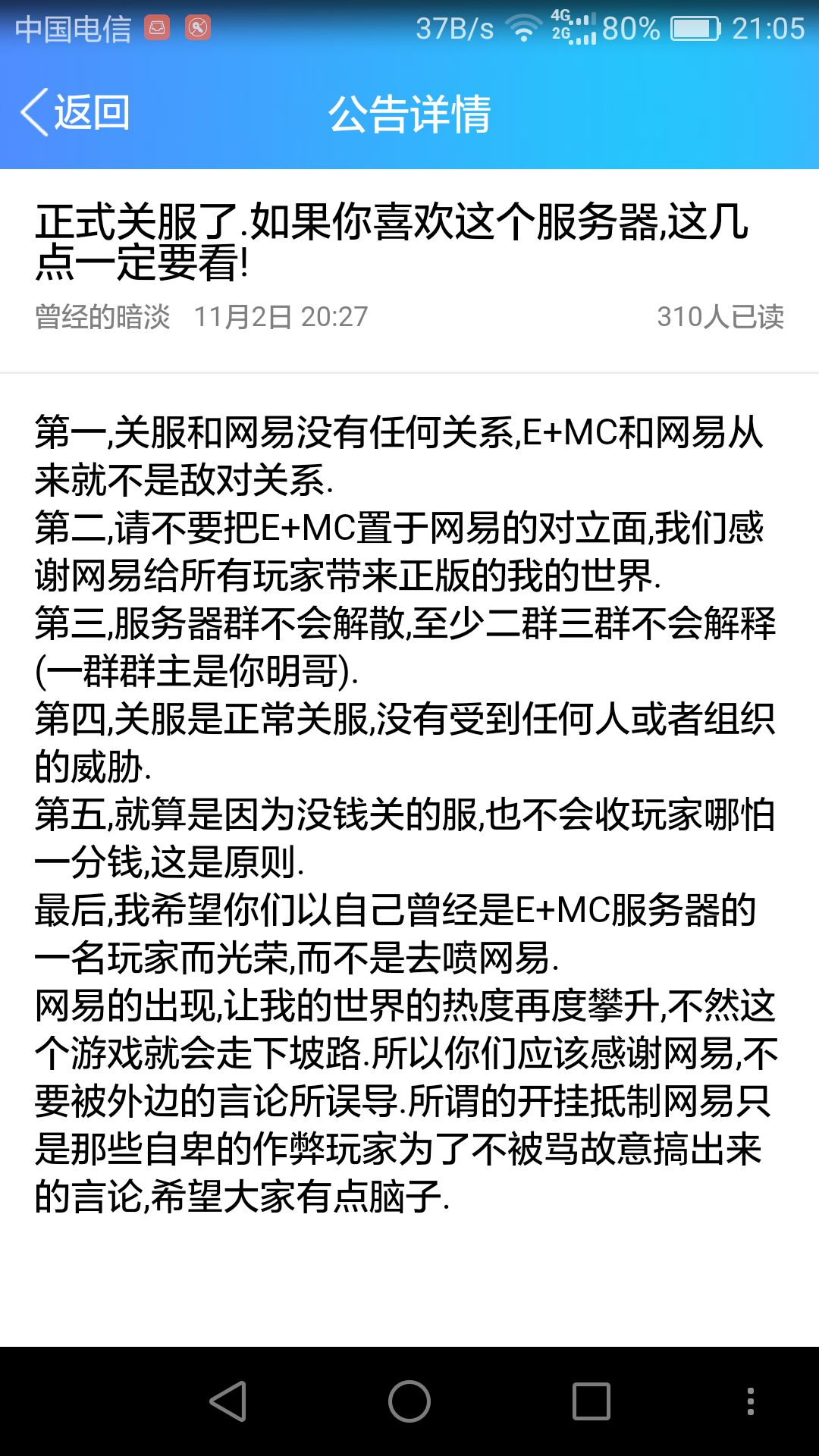 它在今年十一月关服,有人认为这是网易搞事,但腐竹发出声明:如图所示
