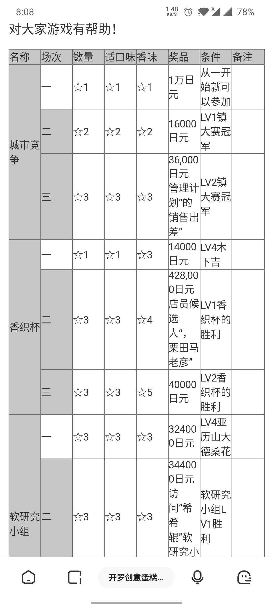 创意糕点部竞赛解锁条件及奖励