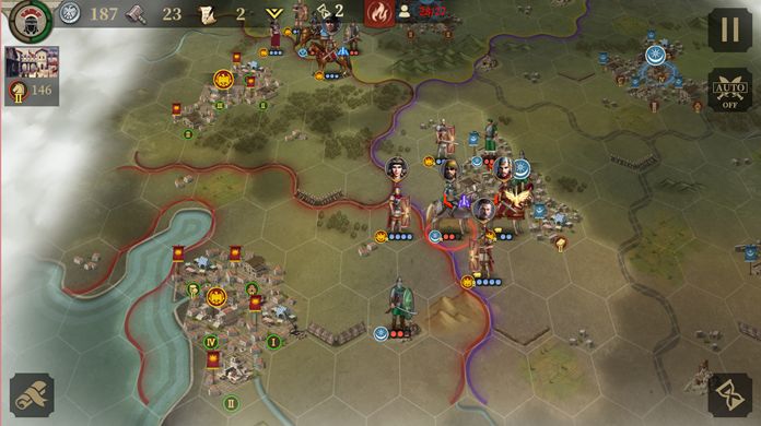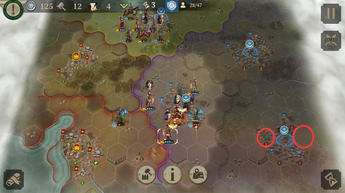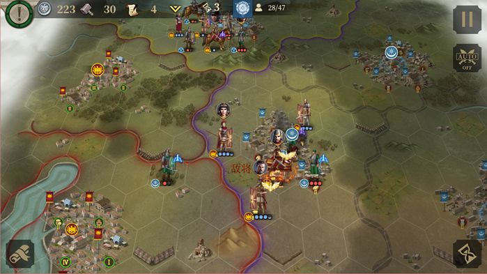 回合3:布局,运气好的话3连击可以直接把敌将打死。商铺建造图书馆(计算下文化数量在5回合时能开始研发总督-急行军),剑士+骑兵攻城。