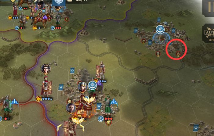 回合4:第四回合攻下城市后触发友军事件,标枪手、庞培、骑兵进攻右上角5级城(庞培站在红圈攻城,再随便配一个兵(建议骑兵)等着占城)。剩余的2个关键人物(红圈)庞培在上图红圈中的时候投矛手自己去右下角红圈杀关键点弓箭敌将。