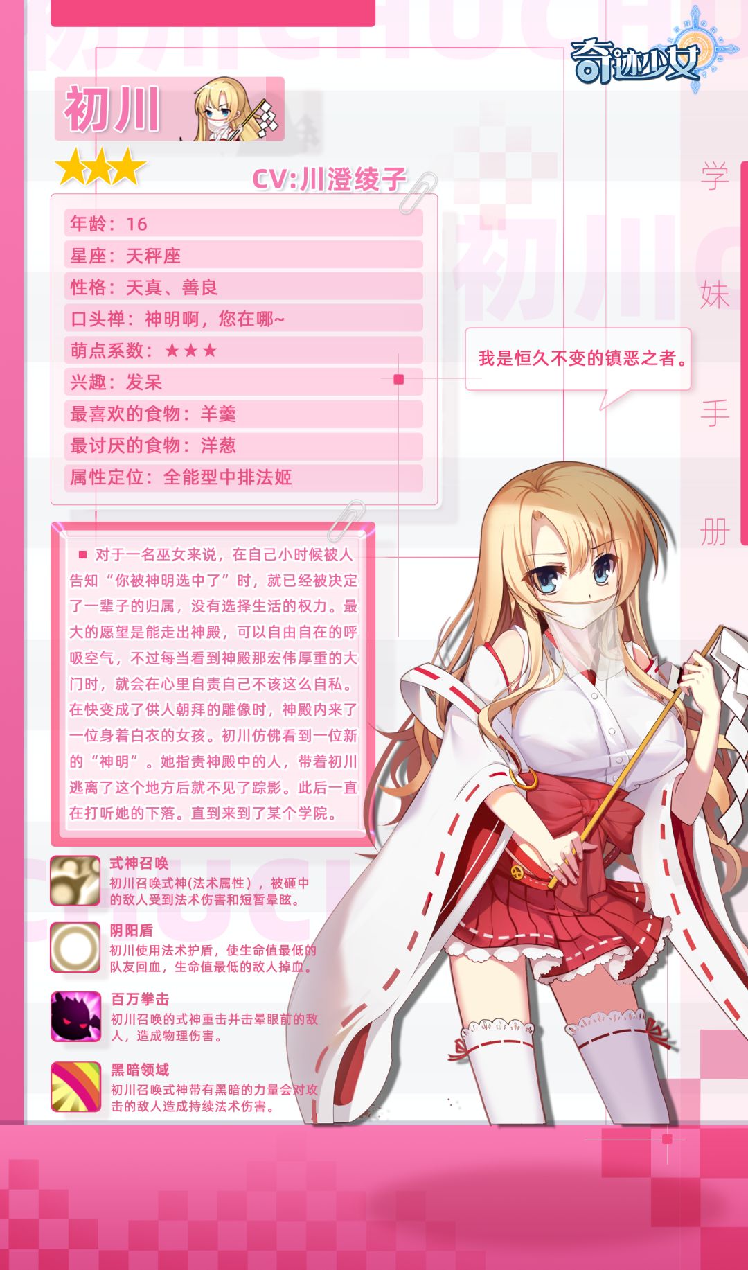 初川从小就被人称为“神明选中的女子”,进入神社的她也将自己的身心都奉献给了神明,是神社中最虔诚的供奉者~