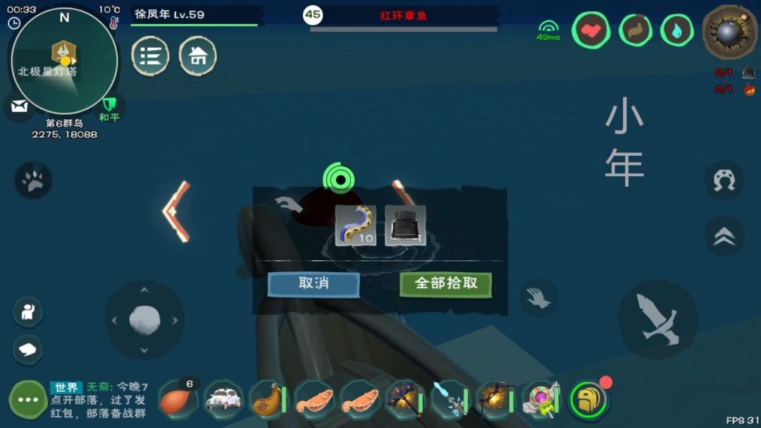 首先大家先得找到红环章鱼(位置在地图四个角的灯塔都有,不过想要过去得花超多时间,157服想要睡袋的可以找我哦)