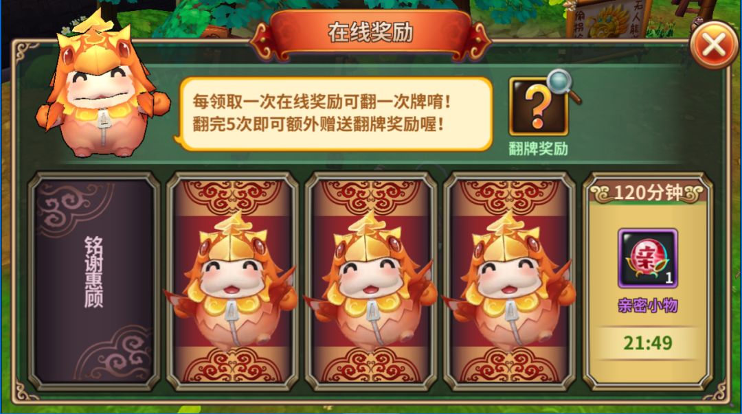 玩游戏嘛,一分耕耘一分收获。巴豆妖会来奖励那些认真游戏的穿越者的哦。不过嘛,穿越者在做什么本巴豆妖也不好考量呢。综合了本妖多年的理解来看,在线的时间是一个相对公平的考量方式呢。每当各位穿越者在线持续一段时间后,会获得一些奖励和一次翻牌子的机会。当牌子全部翻完后,会根据翻到的巴豆妖数量给予各位穿越者额外的奖励。至于额外奖励是什么?天机不可泄露哦~