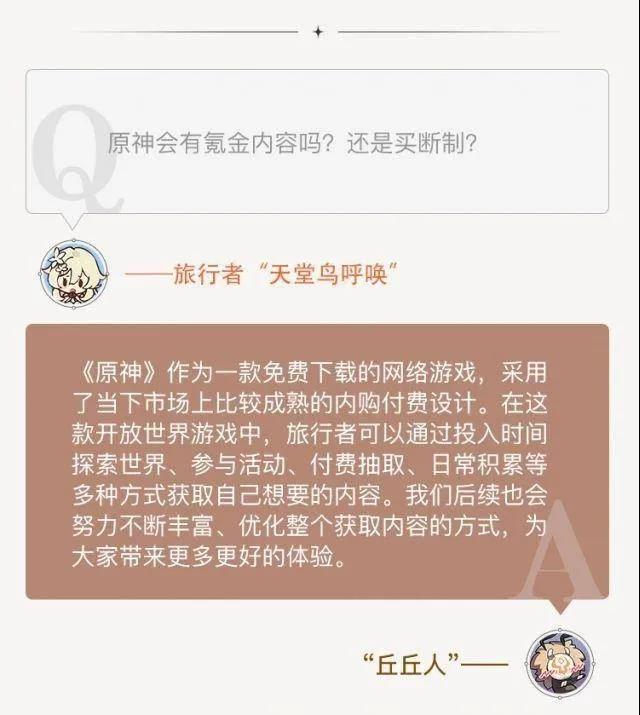 恰好就在今天,开发组还在玩家社区里发了一份「你问我答」,其中有个问题就涉及到付费设计。官方回应对此称,《原神》是款免费网游,会采用市面上相对成熟的内购体系,引入付费抽取的内容。