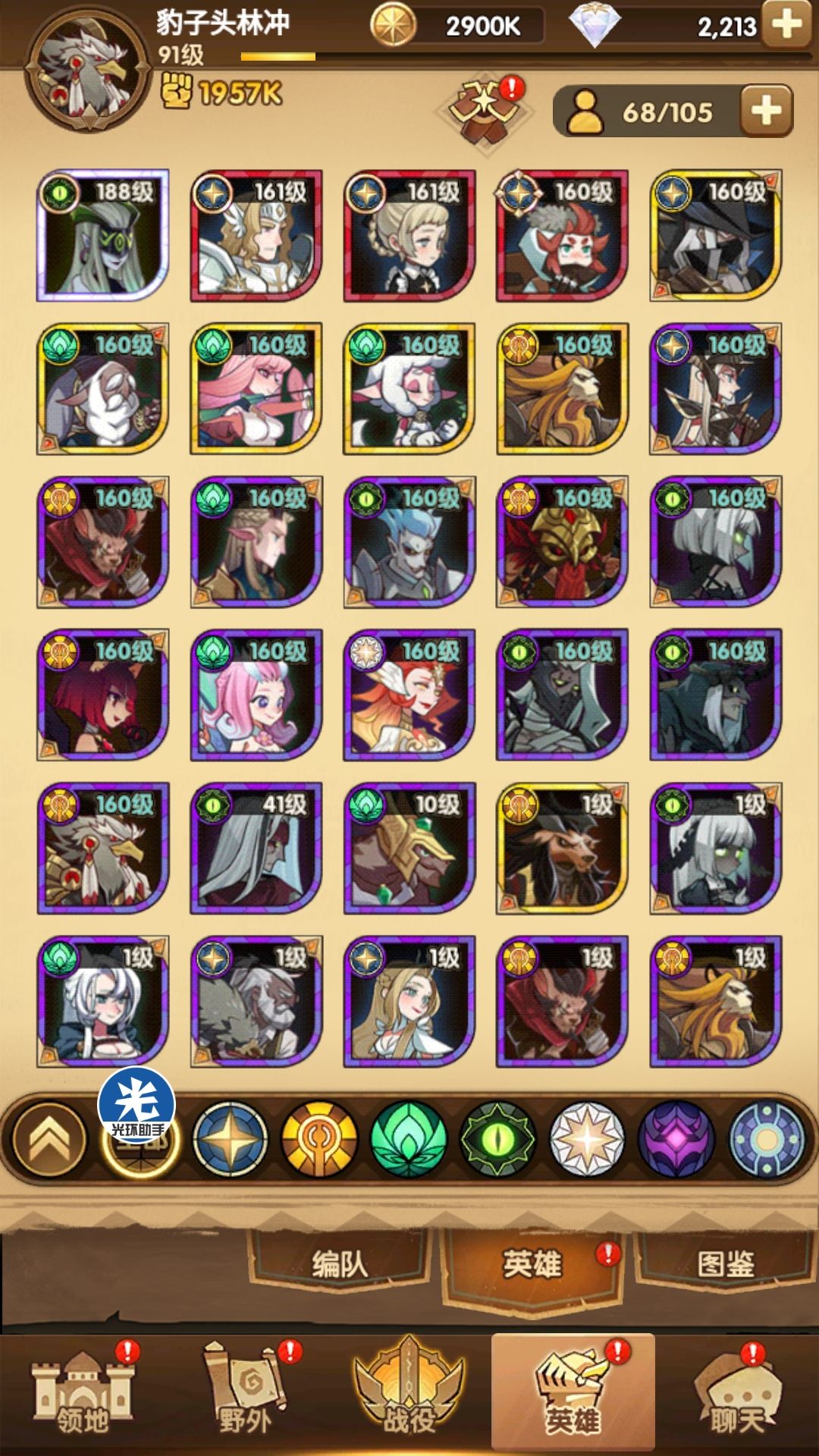 5天前进入20章的我,5天后的我又来了。通关后女妖刚到188级,通关战力68万,几乎卡着最低战力过得图,有的关卡最低战力都不够没法打,还强化了几件紫装充数。用到的英雄包括光三宝,棺材,女妖,凤凰,小鹿,小羊,老头,蝴蝶,共计10名英雄。希望极限过关的朋友,有20章站位细节问题,欢迎提问![[嗒啦啦2_吃瓜]](https://img.tapimg.com/market/images/6eb1d083dff1c09692102cb5a98727f3.gif)