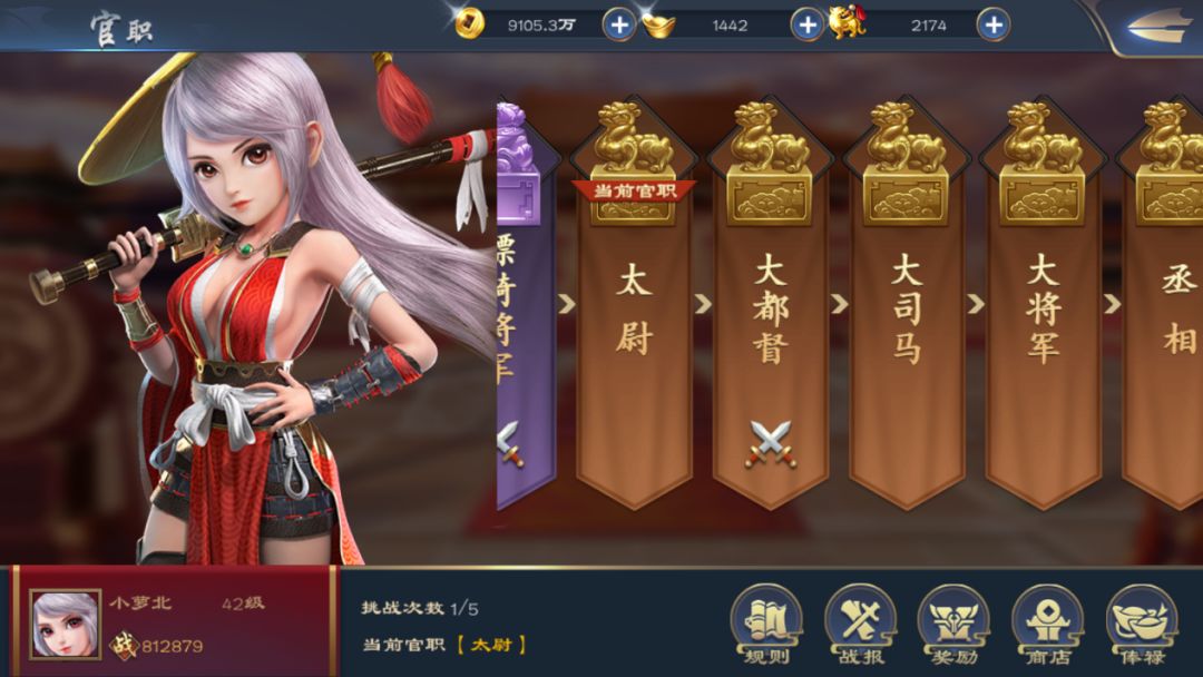 上一期为大家介绍了远征塞外这个版块,这次小编来说说官职挑战这个玩法吧!官职这个玩法主要是挑战每个官职位,挑战成功后可以晋升到下一职位,职位越高,可以获得的奖励越高哦。