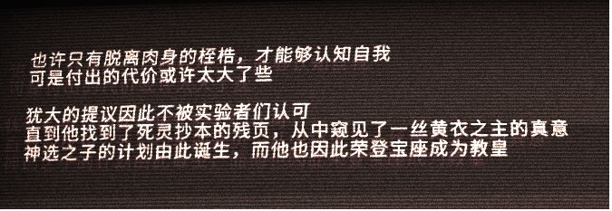 ●游戏背景犹大是教团的主教。犹大病的很重,在外人看来他渴望着永生,所以当时打算将所有人都装进了电脑里面,因此不少人反对。但是永生真的是犹大所希望的吗?他的提议一直不被实验者们认可,直到他找到了死灵抄本的残页,并且从中窥见了一丝黄衣之主的“真意”。他也因此从主教变成了教皇,实施了神选之子的计划。