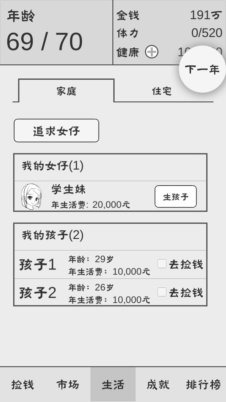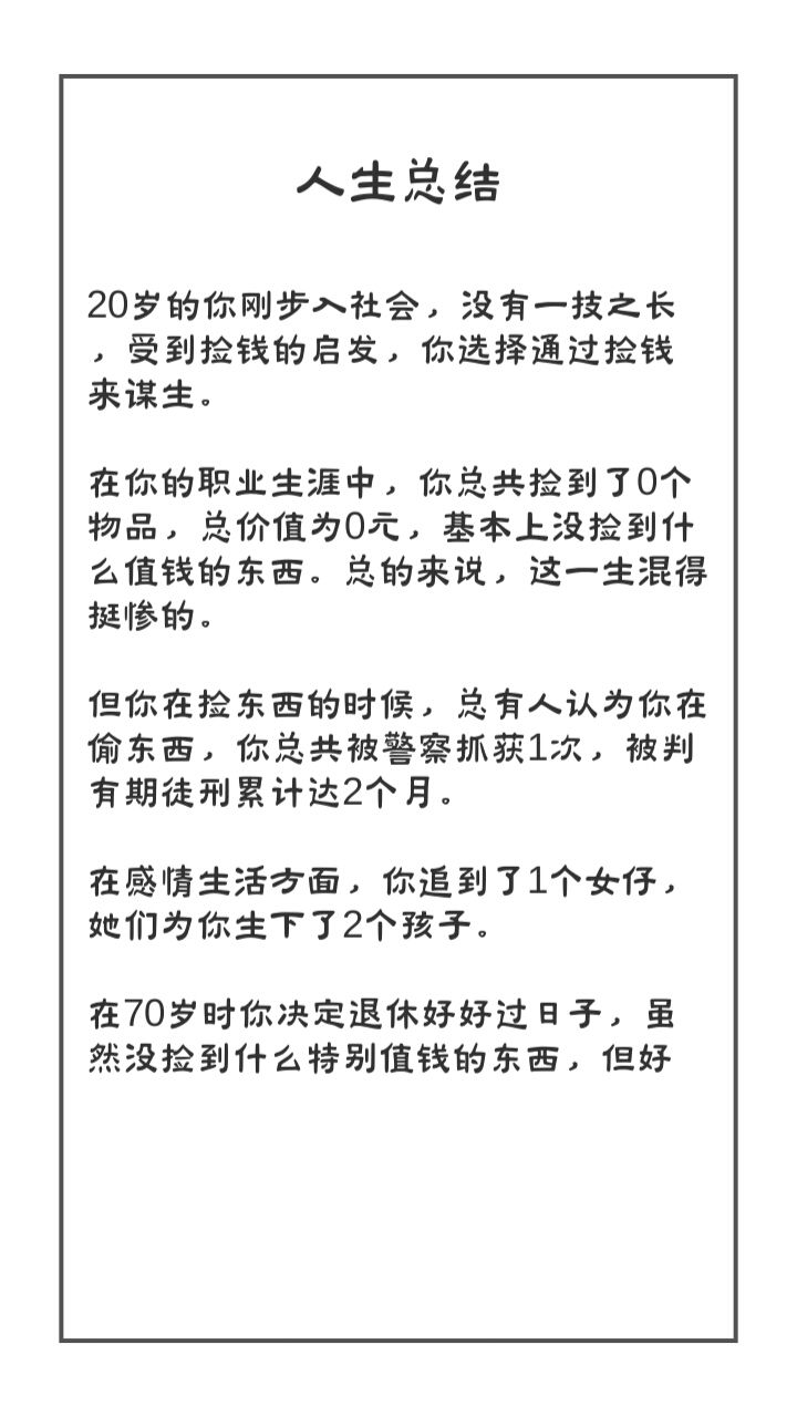 在玩这款游戏时我已经把自己完全代入进去了,我从20岁开始搬砖搬到70岁,一共点了“搬砖”不下千次,这是个捡钱游戏,但我觉得搬砖才是这款游戏的精华。游戏非常好玩,但我只会玩着一次,毕竟人只能活一辈子,这一辈子我不偷不抢追到了我喜欢的女孩、买到了房子、养大我可爱的宝宝,这足以令人满足了,不是吗?
