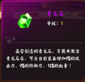 青龙石,效果:当前装备增加9%的攻击力、9%的防御力、12%的血量,从加成上面来看,青龙石比较适合术士这种辅助型角色,在保证自己攻击的同时,还提高了生存能力,是术士的不二之选,当然为什么说适合术士,因为太平衡了,平衡亦是平庸,所以推荐给术士(类似于貂蝉这种定位有误的武将,不适用青龙石)