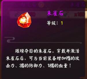 朱雀石,效果:增加9%的攻击力,3%防御力,18%的血量,这个石头,血量高,攻击中等,防御低,典型的血牛石头,最适合的就是猛将了,猛将的属性就是攻击和血量,所以特别适合猛将,本身猛将的防御数值也不高,给猛将加防御的性价比极其的低,所以建议朱雀配猛将,打造朱雀战神
