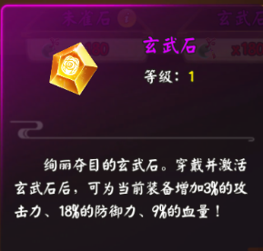 玄武石,增加3%的攻击力,18%的防御力,9%的血量,这个我就不详说了,明显的肉盾专用石头,高额的防御加成和血量加成,让你的肉,肉哭对面,颜色都和禁卫这个地位是一个颜色的,还用多说什么,铁打的肉盾,合金的玄武。