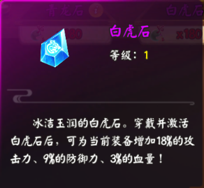 白虎石,效果:当前装备增加18%攻击力,9%防御力,3%的血量,白虎石的加成很容易可以看出,这是输出专用的石头了,比较适合输出型的武将(谋士、神箭还有定位错误的貂蝉),18%的攻击力算是高的吓人了,一个石头可以为单件装备提升18%的攻击力(虽然不是很清楚装备究竟加多少的属性,有兴趣的大大可以自己测试一下了),高额的攻击力加成注定了这是一个输出专属石头,当然不是说一定只适合输出,如果喜欢爆发的话,可以给全队的武将都装上这个石头,可以达到秒图的效果。