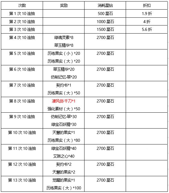 活动内容:十连抽打折优惠,多次参与还可获得获得强化素材、5星灵装、全新5星风属性联动角色“IA”抽出的概率提高。