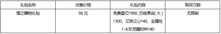 活动期间内,樱之赠物礼包限时登录游戏内道具屋,礼包内含有稀有道具:免费星石、角色强化素材,全属性角色潜能觉醒素材等多种好礼。