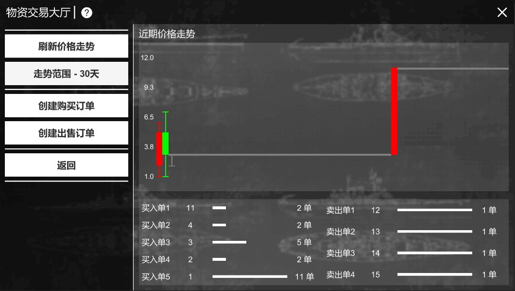 进入物资详情后,您可以通过右侧了解该物资的K线走势图和最近5个等待被进行交易的买入/卖出订单的价格作为您提交订单时的参考。在您确定提交意愿后,您可以了解该物资的近期的架构走势并创建购买或出售订单。