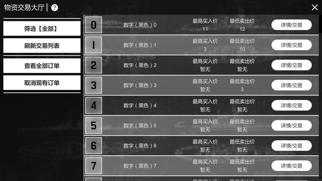 在交易大厅主界面您可以浏览到所有目前在游戏中进行出售的物资,物资的最高买入价代表如果您要立即出售本物资,您的出价最高不能高于最高买入价。最低卖出价代表您想立即获得该物资,至少需要提交一个定价大于或等于最低卖出价的订单,暂无代表并未有玩家进行该物资的购买或者出售,如何您对该物资有购买或出售意向可能需要等待一段时间来达成交易。同时,点击右侧“详情/交易”按钮即可对该物资进行售价趋势了解与提交购买/出售订单的操作,同时您所发布所有的订单也可以在左侧查询到。