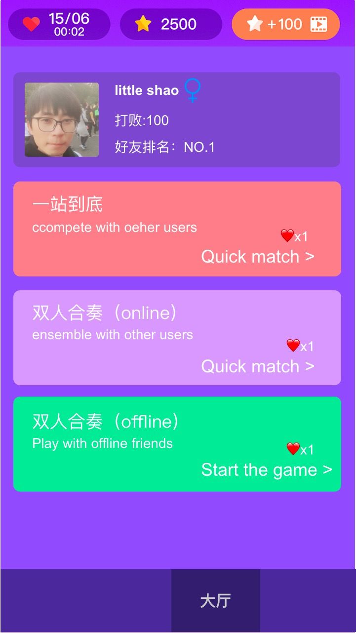 相信大家在游戏的同时更喜欢的是有多人的实时互动,可以跟其他玩家进行实时的pk,这样是不是就不会那么无趣了~!独乐乐不如众乐乐嘛~!而且在房间模式下,可能你们会认识到不同且相同爱好的您们哟~!还有每次开局的歌曲都是随机的,嘿嘿~!遇到自己熟悉的歌曲就神挡杀神,佛挡杀佛吧~!!组队双人合奏赛,后续一波发布~!