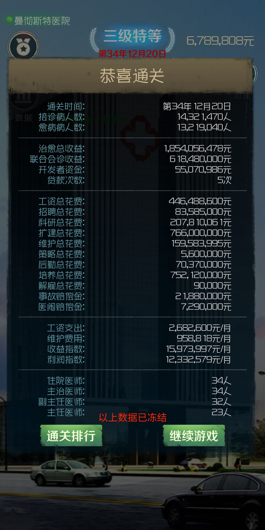 4.后期的世界级科室每个科室2到3名主任医师,逐个升到10次满级,定级治愈率的提高会大幅度增加收入指数。
