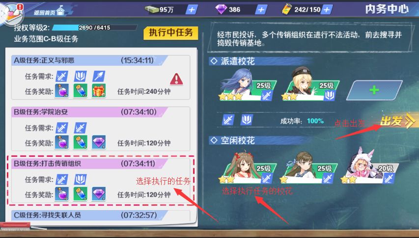 3、每个任务都有成功率,越高级的任务对校花的要求越高。影响成功率的因素有:校花等级、星级、战斗力以及任务所需的校花类型搭配。