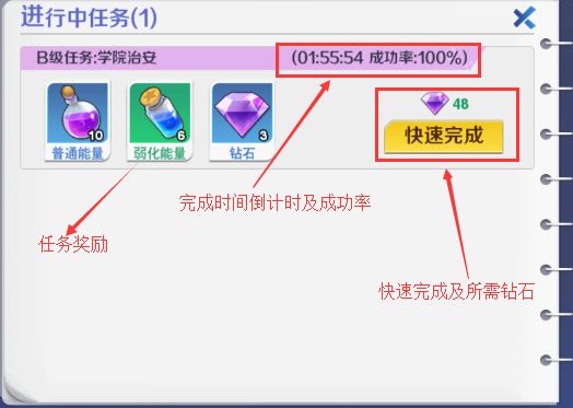 4、点击执行中的任务可以看到进行中的任务进度(完成时间),可以点击”快速完成”消耗一定量的钻石立即完成该任务。