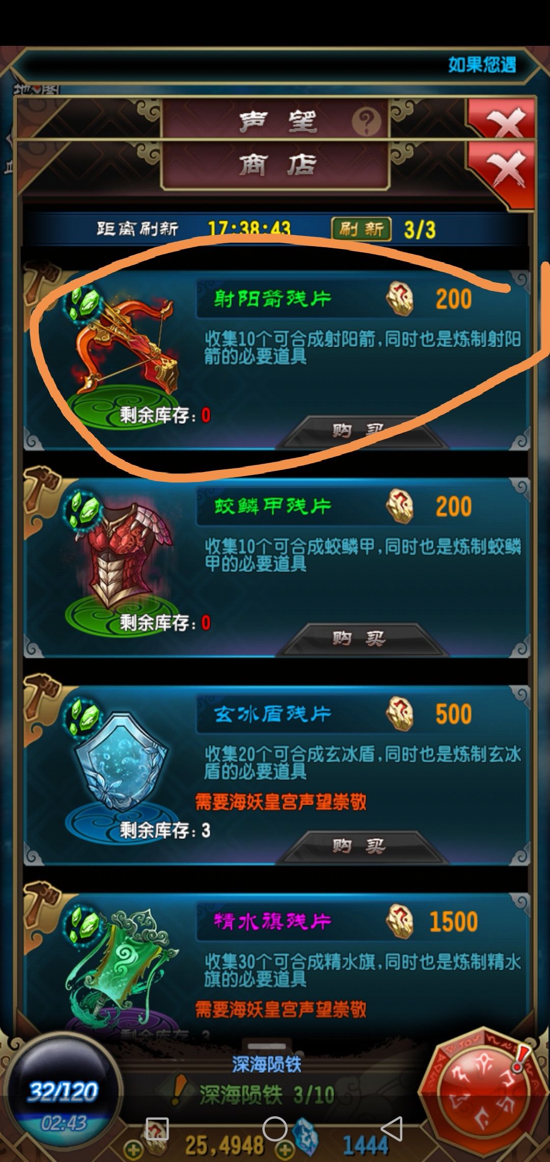 这些都是每日必买的,每天晚上九点刷新。不要忘了哦!最后一个只能买一次,也是我说的100个射阳箭残片的获取方法。