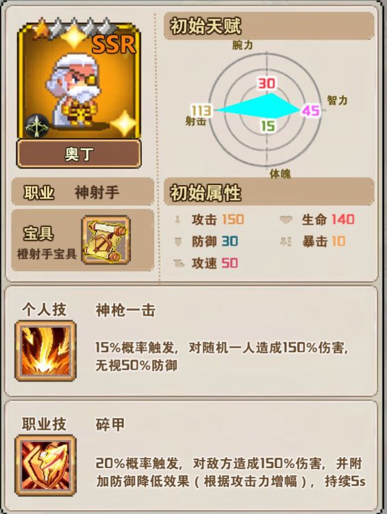 (2)神射手:职业技碎甲,20%概率触发,对敌方造成150%伤害,并附加防御降低效果,持续5S。(建议在第3,4排输出)