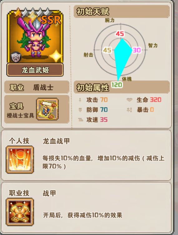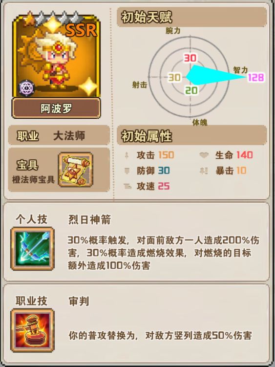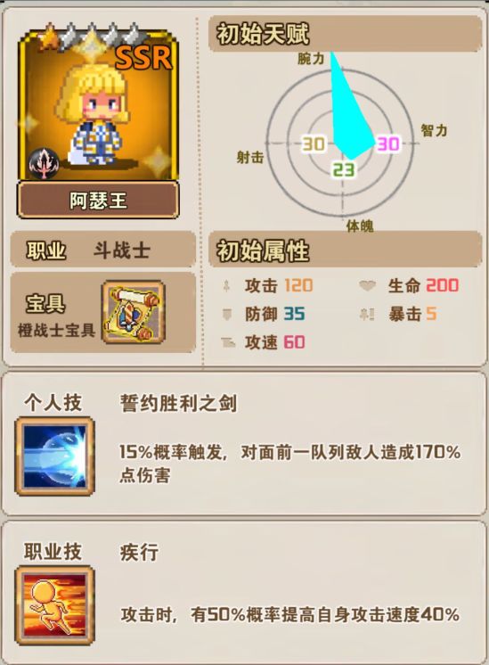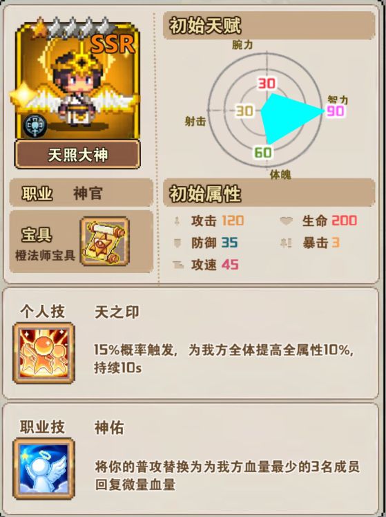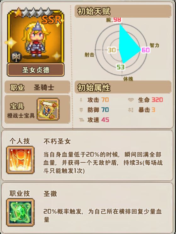 (2)圣骑士:职业技能圣徽,20%概率触发,为自己所在横排回复少量血量。(建议在第一排肉盾)