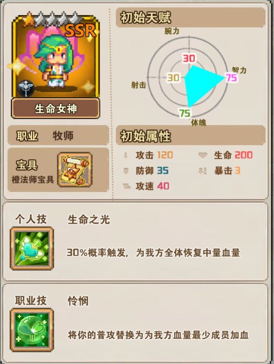 (3)牧师:职业技怜悯,将你的普攻替换为为我方血量最少成员加血。(强力奶妈,是持续战斗必不可少的哦,建议在第3排)
