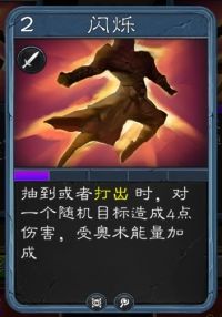消耗二点行动力,抽到或者打出时,可以对一个随机目标造成4点伤害,受奥术能量加成!(奥术能量是什么呀~我也不清楚呐⁄(⁄ ⁄•⁄ω⁄•⁄ ⁄)⁄)