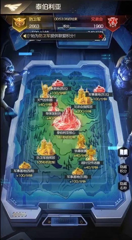 在开局首占的争夺中,双方在第一时间就对场上的大部分建筑进行了单撞。第一轮的交手后红色方【君临天下】拿下了防卫军指挥部和2个军事基地、2个功能性建筑。与【涅槃重生】各占半壁江山,而【涅槃重生】却在稳住自身局势后,在防卫军指挥部倒计时结束前组队拿下了这一高分建筑,取得了首占积分的优势。