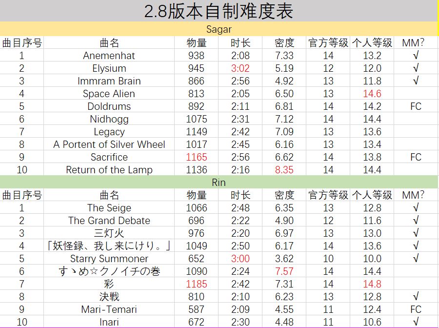 很可惜Rb椰叶在更新完1.9.1版本的难度表之后就再也没有继续更新了,很多新版本增添的曲目都没有收录进去,这就造成了部分玩家对于这些歌曲实际标级产生了疑问。趁着这几天学习的空隙,我根据自己的实际情况制作了一份2。8版本的难度表,和大家一起分享。