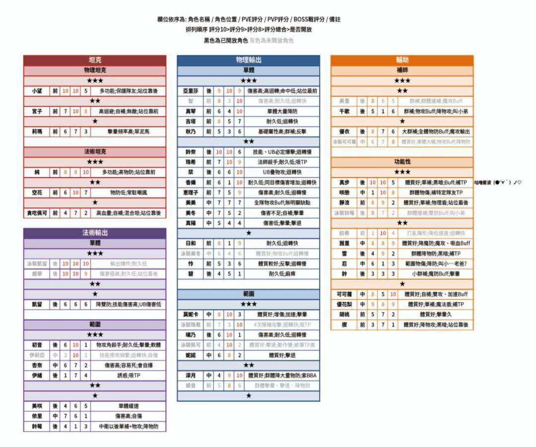 图分别为:角色姓名/角色位置/推图评分/竞技场评分/BOSS战评分