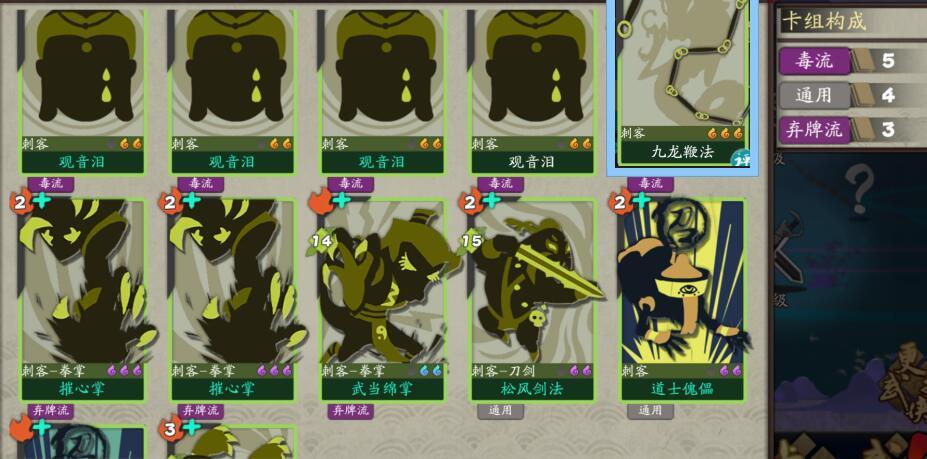 记得成型牌组要删掉毒针和铁布衫,魔教内功和擒拿手,做到 牌组精简, 绵掌可以留。