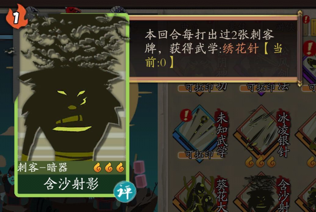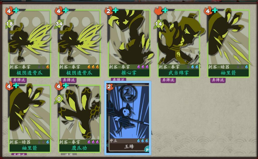 这样初始牌组有俩 毒针和一 武当绵掌(以下简称 绵掌)。