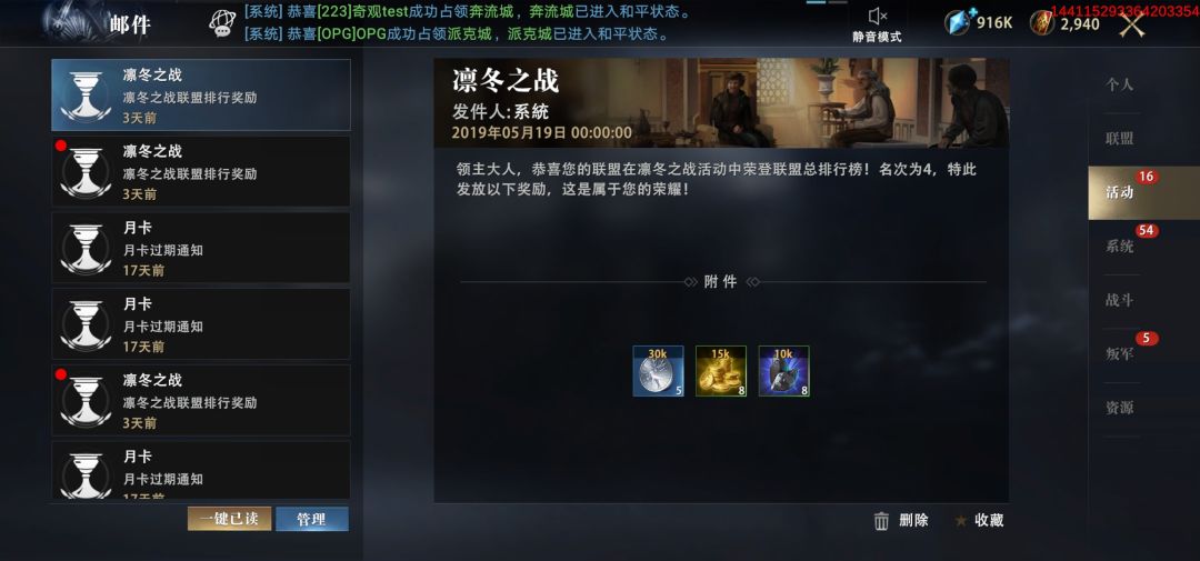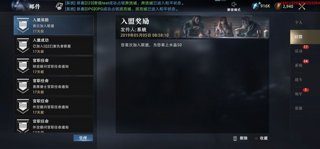 邮件系统分为个人邮件、联盟邮件、活动邮件、系统邮件、战斗邮件、叛军邮件、资源邮件等7个分界面。