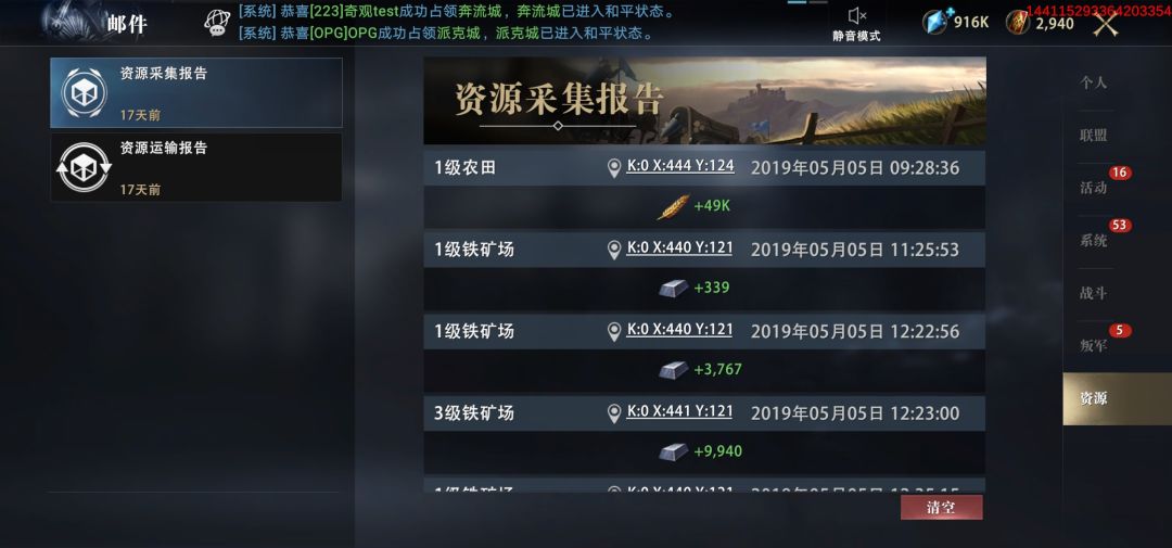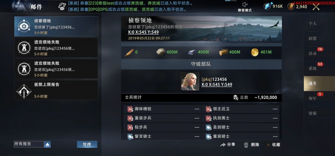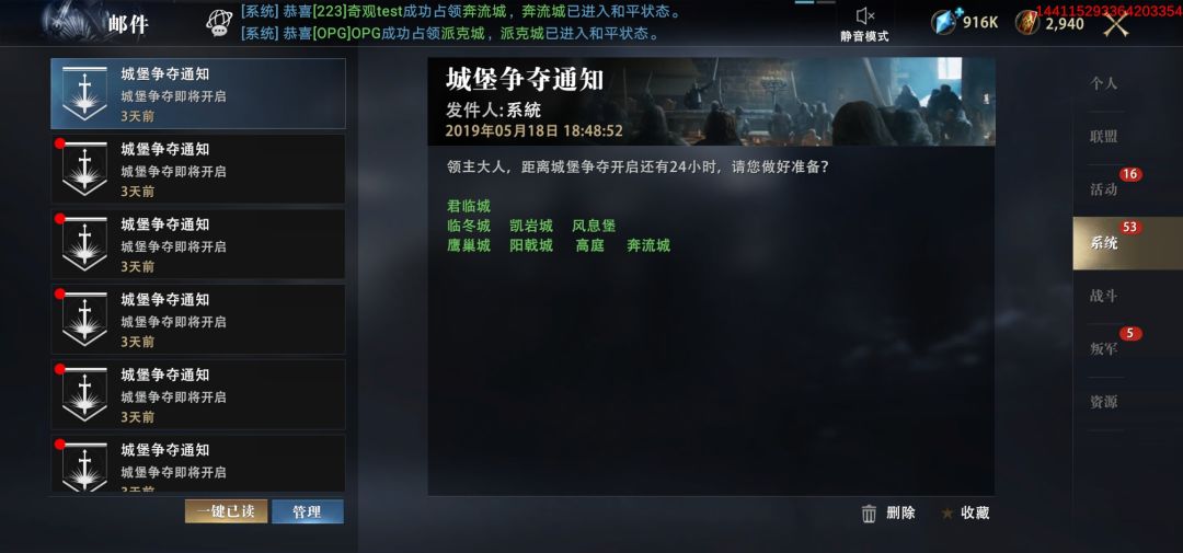 邮件系统可让我们全面了解游戏联盟、活动、战斗、资源等重要信息,及时知道自己的战斗损失、实力留存等情况,更可通过邮件查看重要的侦察信息,使我们的战役更易胜利等。还有个人邮件可助我们增进与好友间的联系,更加方便与好友协同作战、互帮互助,领主大人们需多加关注此系统信息!