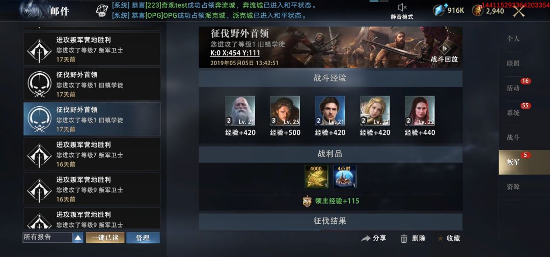 此邮件界面主要报告进攻背誓者要塞、进攻叛军营地、征伐野外首领等战斗信息。战斗的胜利与失败、敌方我方战斗后的兵力损失、战斗奖励等信息都会在此得到详细报告。战报界面还可查看战斗回放。